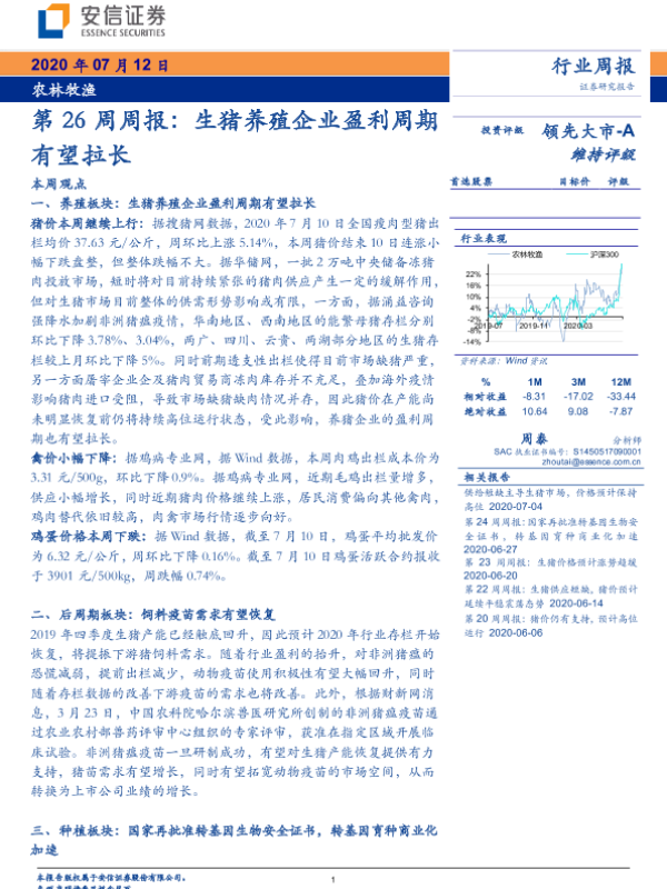 【安信证券】【20200712】20200712-安信证券-农林牧渔第26周周报:生猪养殖企业盈利周期有望拉长-22页 行业研究