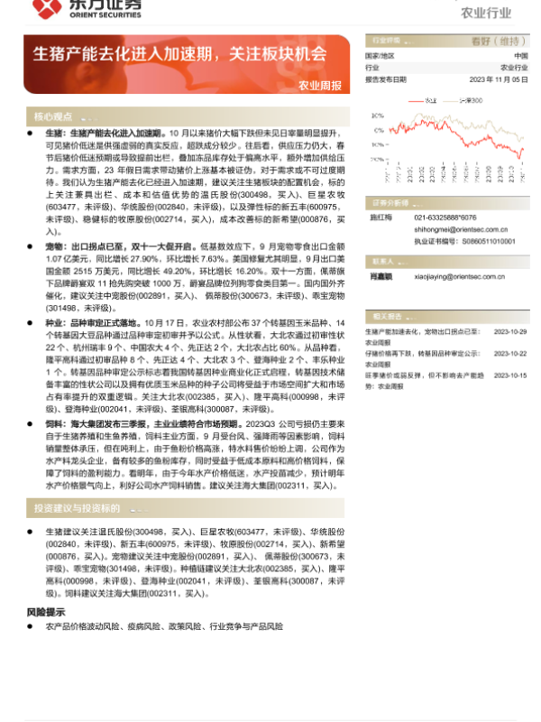 【东方证券】【20231105】20231105-东方证券-农业周报:生猪产能去化进入加速期,关注板块机会-12页 行业研究