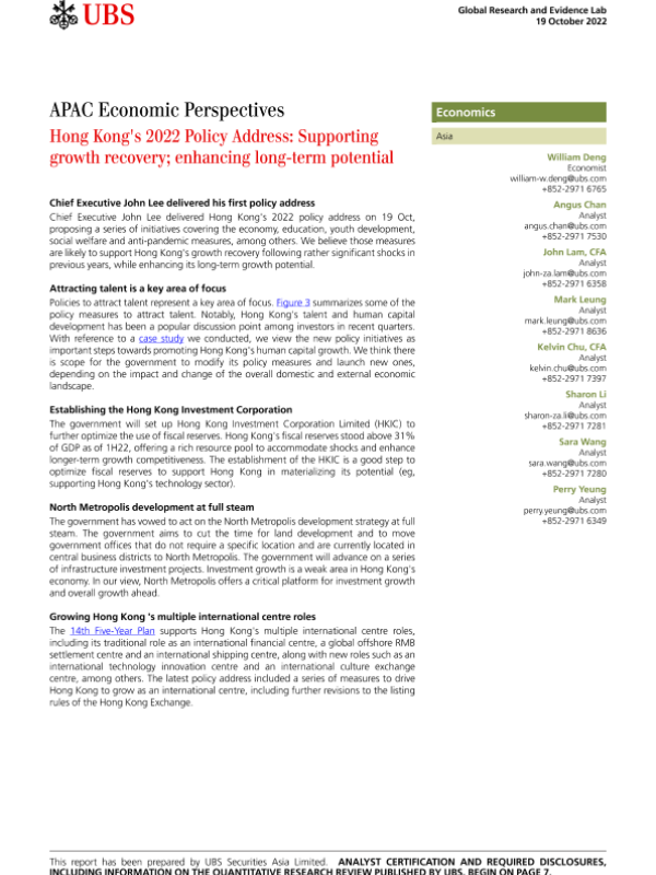 【UBS Securities Asia Limited】【20221019】omics-APAC Economic Perspectives Hong Kong's 2022 Policy Address-10页 行业研究