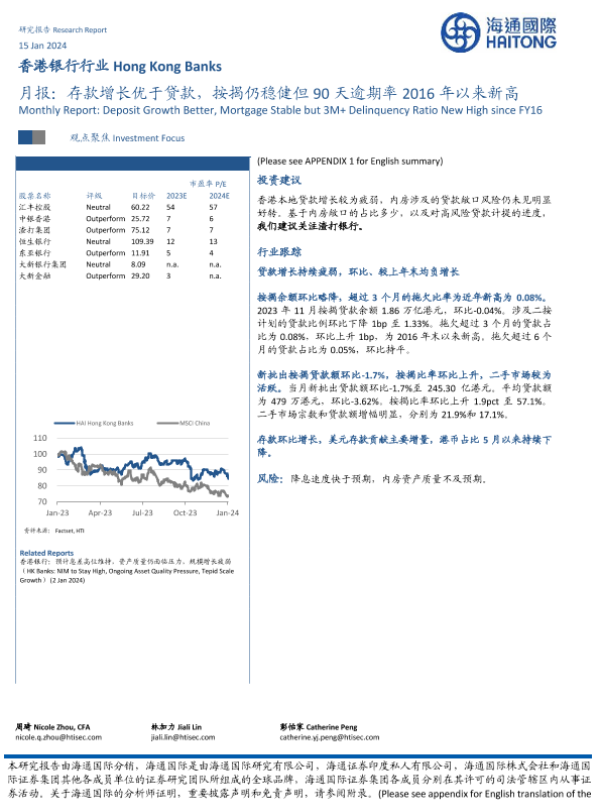 【海通国际】【20240115】香港银行行业月报:存款增长优于贷款,按揭仍稳健但90天逾期率2016年以来新高-13页 行业研究