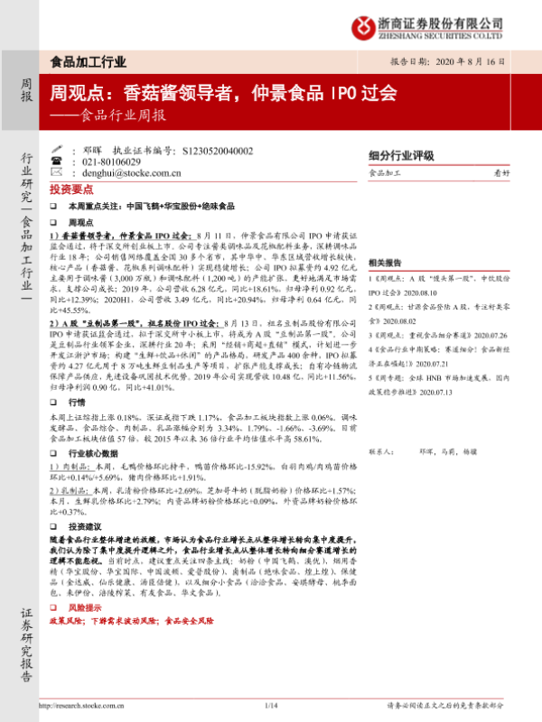 【浙商证券】【20200816】20200816-浙商证券-食品行业周报:香菇酱领导者,仲景食品IPO过会-14页 行业研究