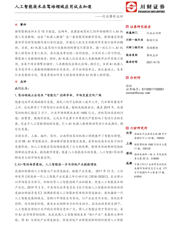 【川财证券】【20210415】高端制造行业事件点评:人工智能技术在驾培领域应用试点加速-3页 证券期货研究报告