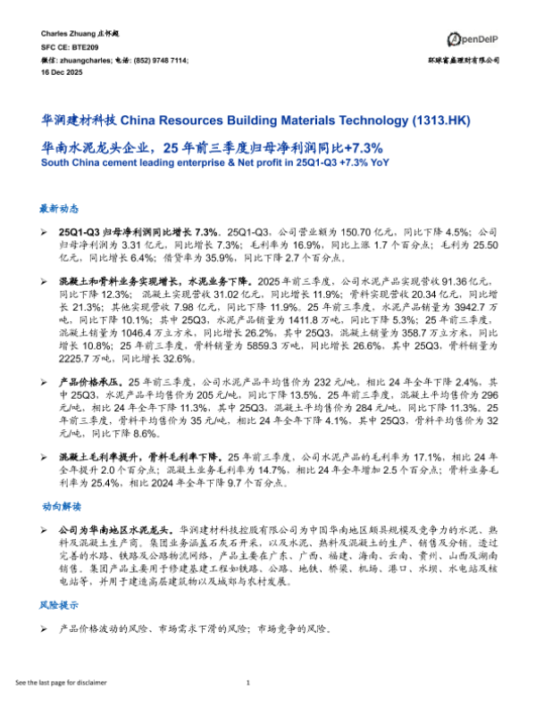 【环球富盛理财有限公司】【202512】华润建材科技 China Resources Building Materials Technology(1313.HK) 华南水泥龙头企业,25年前三季度归母净利润同比+7.3%-3页 证券期货研究报告