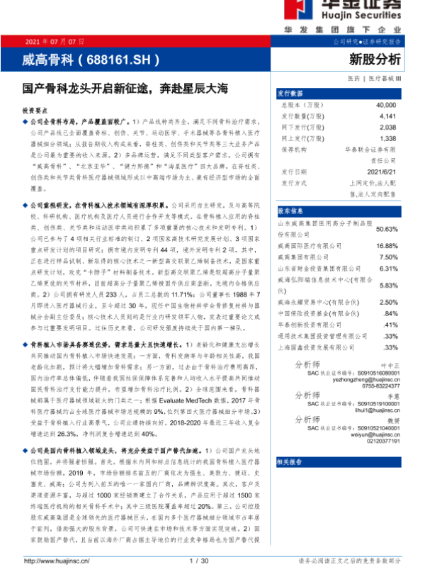 【华金证券】【20210707】威高骨科-688161.SH-国产骨科龙头开启新征途,奔赴星辰大海-30页 行业研究