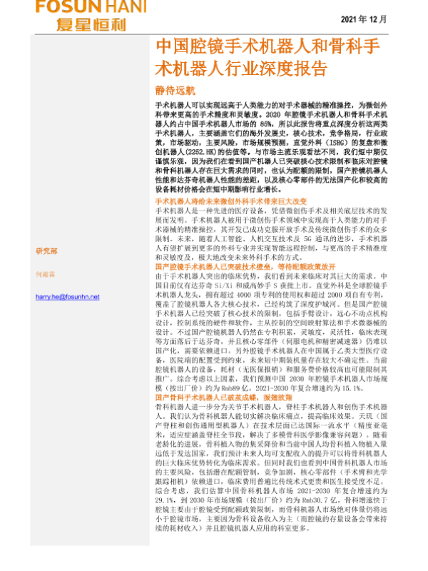 【复星恒利】【20211228】中国腔镜手术机器人和骨科手术机器人行业深度报告-54页 行业研究