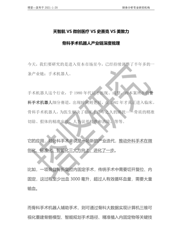 【塔坚】【20210120】天智航VS微创医疗VS史赛克VS美敦力:骨科手术机器人产业链梳理-31页 行业研究