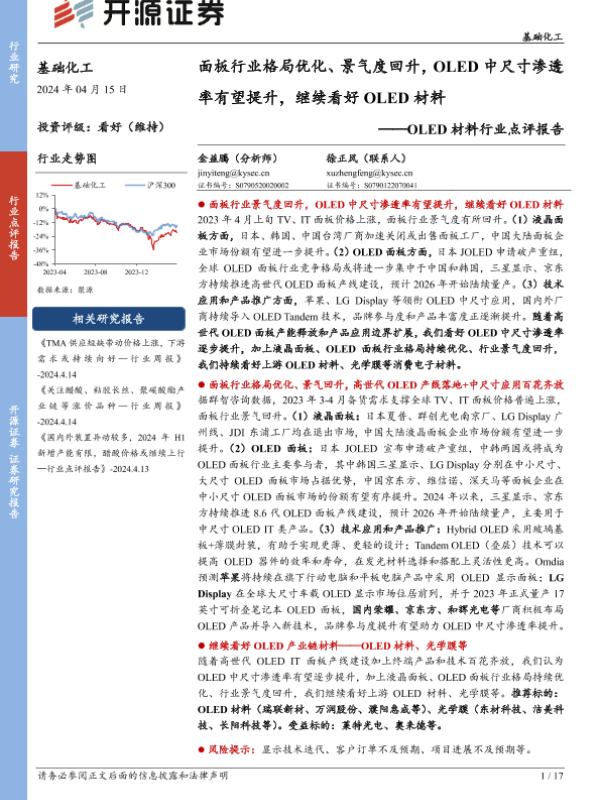 【开源证券】【20240415】基础化工OLED材料行业点评报告:面板行业格局优化、景气度回升,OLED中尺寸渗透率有望提升,继续看好OLED材料-17页 行业研究