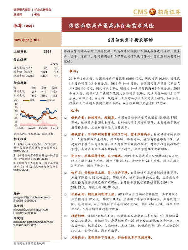 【海通证券】【20190716】20190716-招商证券-钢铁行业点评报告:6月份供需平衡表解读:依然面临高产量高库存与需求风险-7页 行业研究