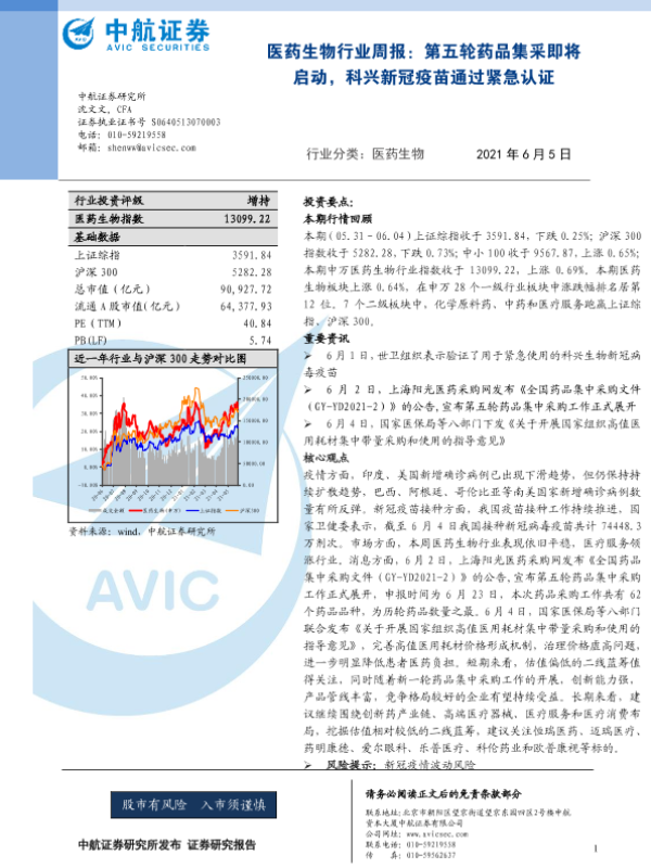 【中航证券】【20210605】医药生物行业周报:第五轮药品集采即将启动,科兴新冠疫苗通过紧急认证-8页 行业研究