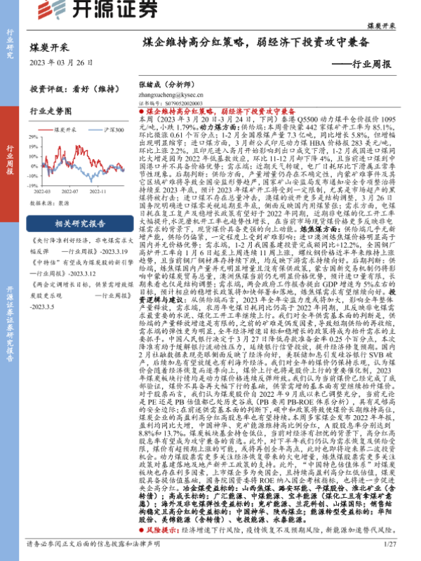 【开源证券】【20230326】20230326-开源证券-煤炭开采行业周报:煤企维持高分红策略,弱经济下投资攻守兼备-27页 行业研究