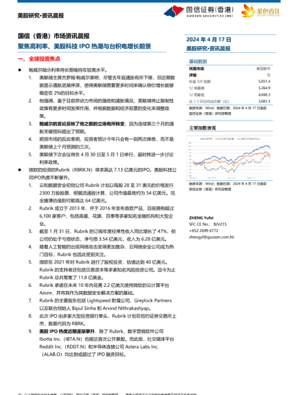 【国信证券(香港)】【20240417】市场资讯晨报:聚焦高利率、美股科技IPO热潮与台积电增长前景-13页 行业研究