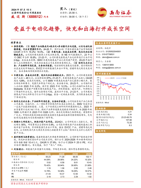 【西南证券】【20240715】威迈斯(688612)受益于电动化趋势,快充和出海打开成长空间-45页 行业研究