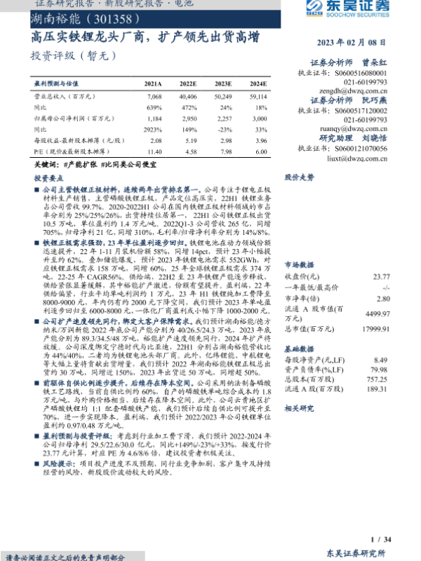 【东吴证券】【20230208】高压实铁锂龙头厂商,扩产领先出货高增-34页 证券期货研究报告