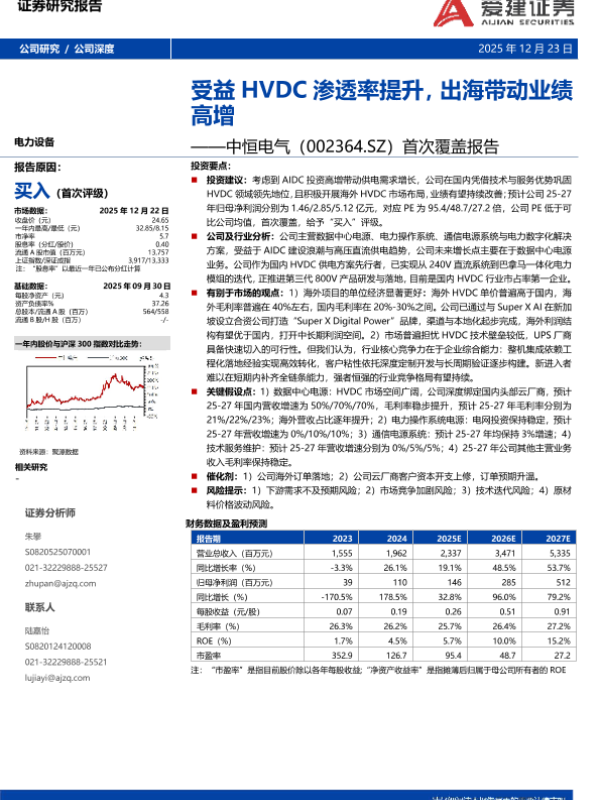 【爱建证券】【202512】受益 HVDC渗透率提升,出海带动业绩高增——中恒电气(002364.SZ)首次覆盖报告-21页 证券期货研究报告