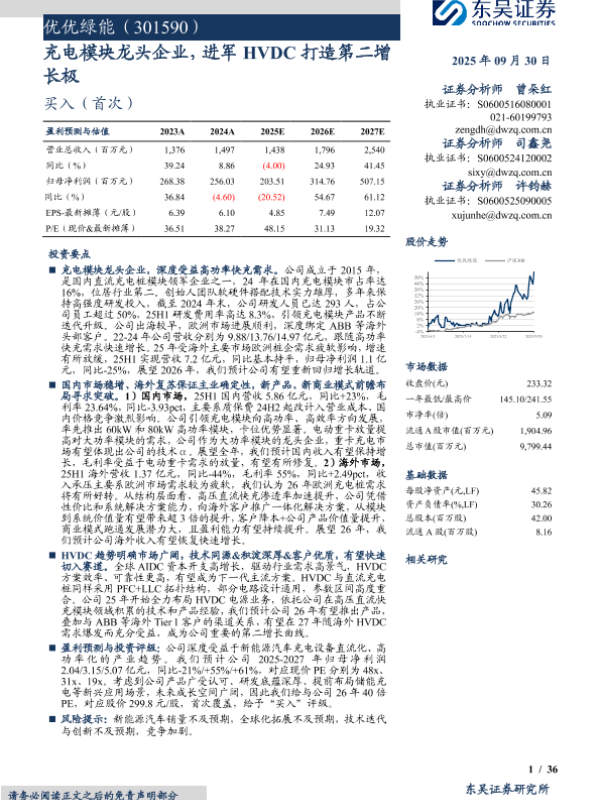 【东吴证券】【202509】优优绿能(301590)充电模块龙头企业,进军HVDC打造第二增长极-36页 公司研究