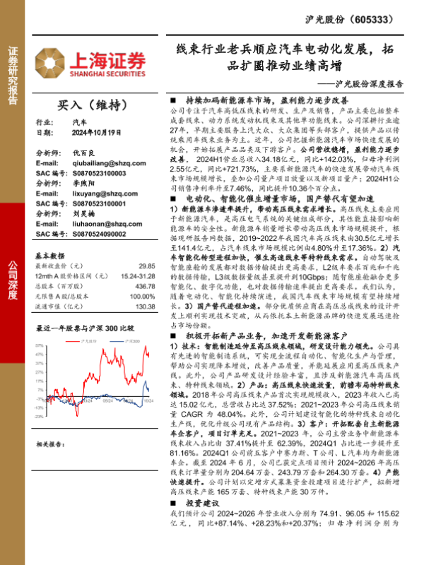 【上海证券】【20241019】沪光股份(605333)深度报告:线束行业老兵顺应汽车电动化发展,拓品扩圈推动业绩高增-26页 行业研究