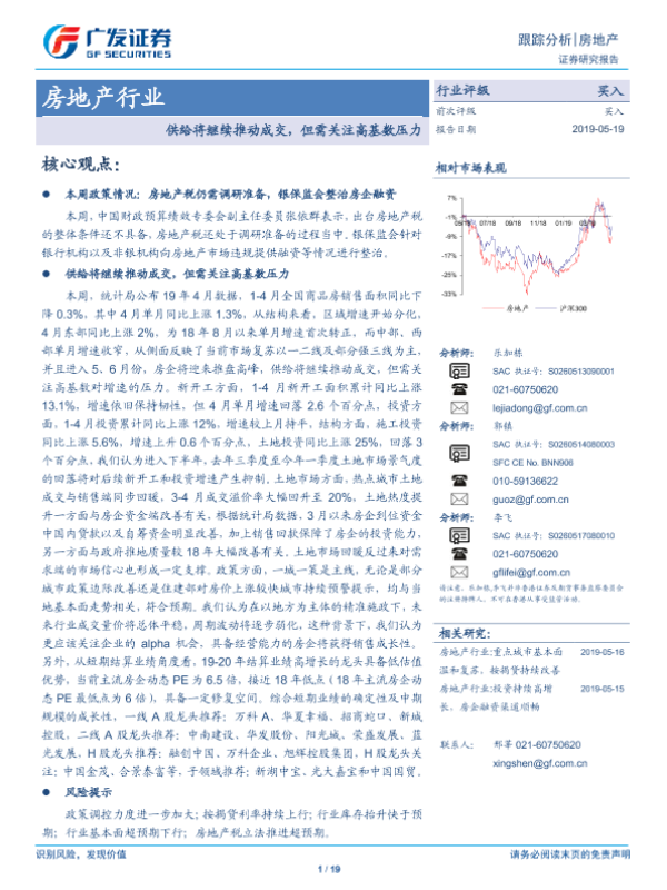 【广发证券】【20190519】房地产行业跟踪分析:供给将继续推动成交,但需关注高基数压力-19页 行业研究