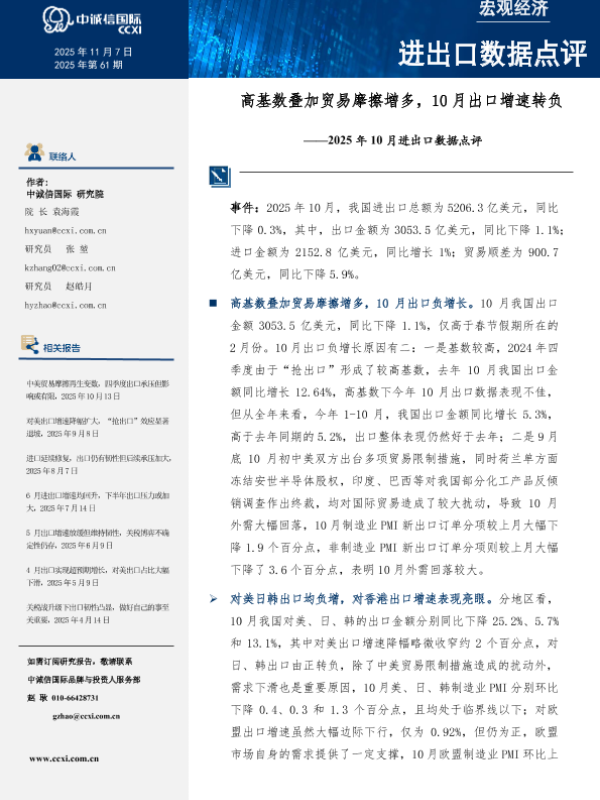 【中诚信国际】【202510】2025年10月进出口数据点评:高基数叠加贸易摩擦增多,10月出口增速转负-6页 宏观策略