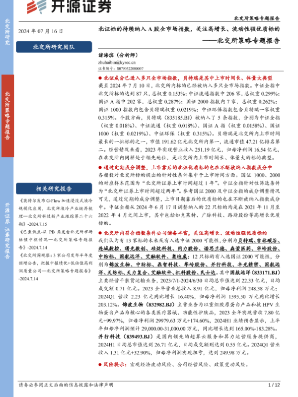 【开源证券】【20240716】北交所策略专题报告:北证标的持续纳入A股全市场指数,关注高增长、流动性强优质标的-12页 行业研究