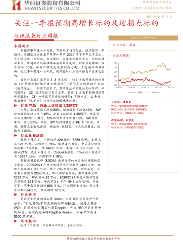 【华西证券】【20210411】纺织服装行业周报:关注一季报预期高增长标的及迎拐点标的-16页 行业研究
