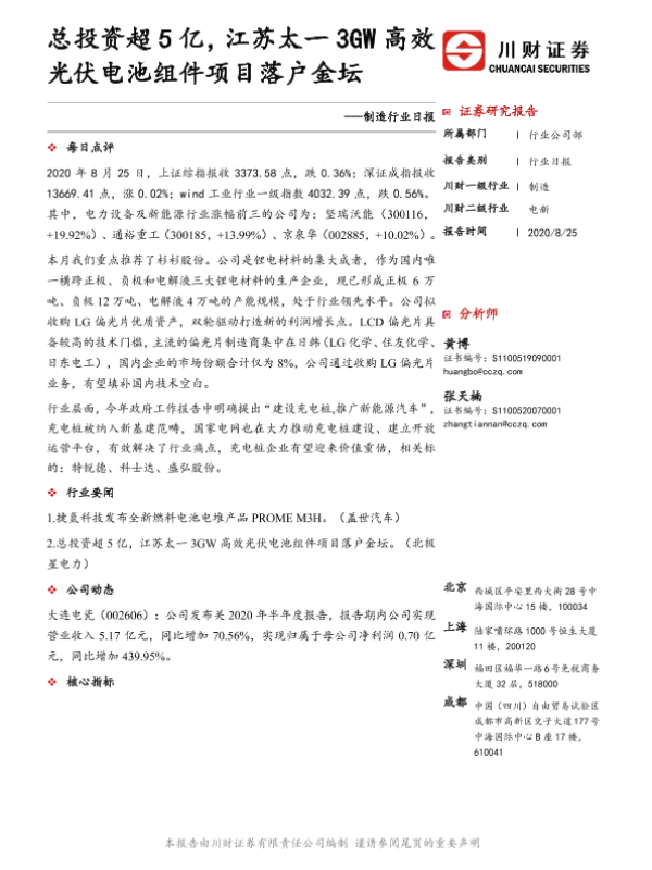 【川财证券】【20200825】制造行业日报:总投资超5亿,江苏太一3GW高效光伏电池组件项目落户金坛-3页 证券期货研究报告