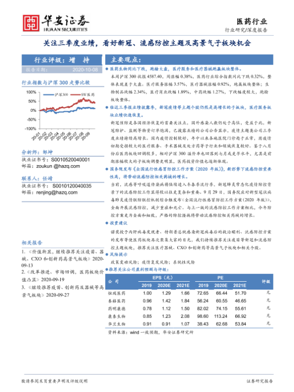【华安证券】【20201008】关注三季度业绩,看好新冠、流感防控主题及高景气子板块机会-15页 行业研究
