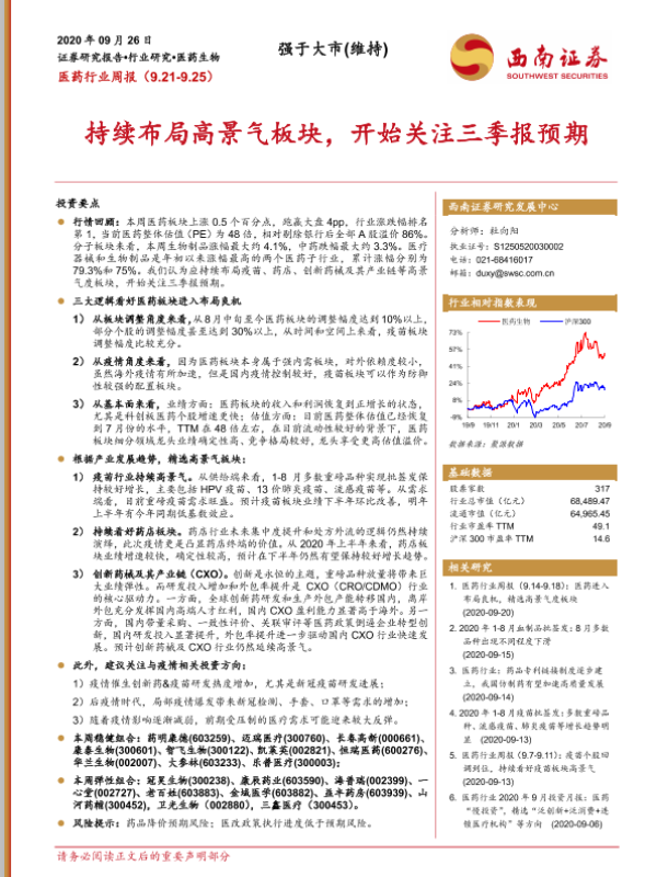 【西南证券】【20200926】医药行业周报:持续布局高景气板块,开始关注三季报预期-25页 行业研究