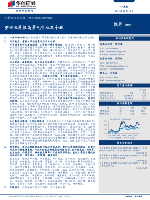 【华创证券】【20191013】计算机行业周报:重视三季报高景气行业及个股-23页 行业研究