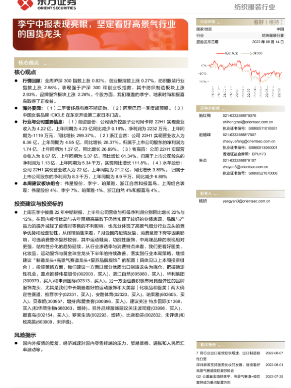【东方证券】【20220814】20220815-东方证券-纺织服装行业周报:李宁中报表现亮眼,坚定看好高景气行业的国货龙头-8页 行业研究
