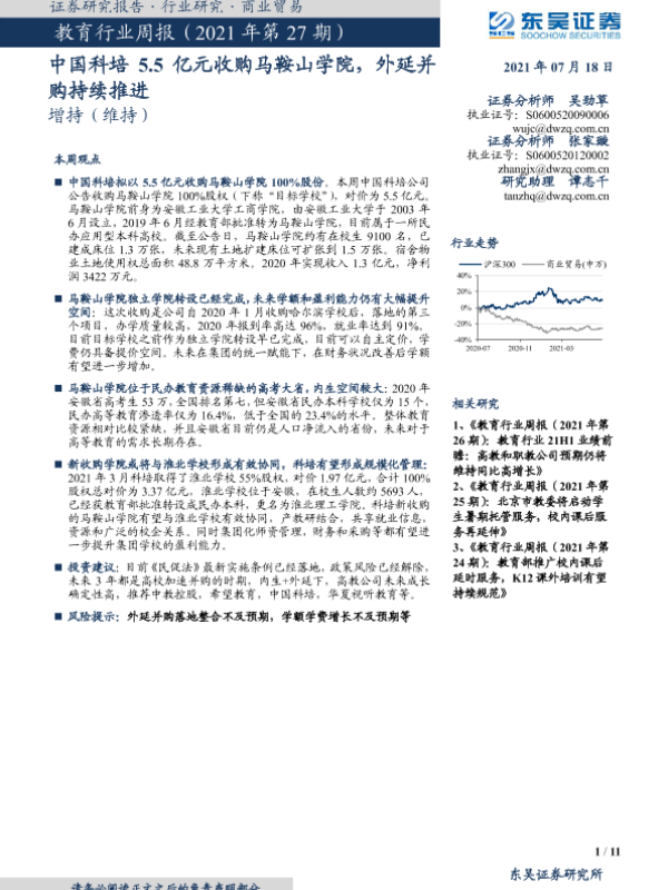 【东吴证券】【20210718】教育行业周报(2021年第27期):中国科培5.5亿元收购马鞍山学院,外延并购持续推进-11页 行业研究