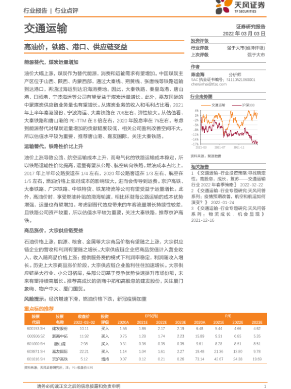 【天风证券】【20220303】交通运输:高油价,铁路、港口、供应链受益-3页 行业研究