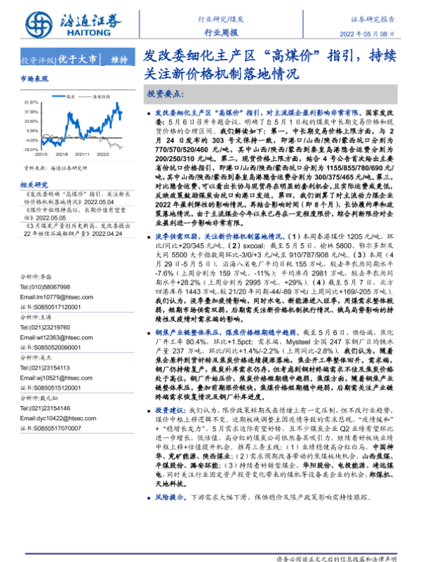 【海通证券】【20220508】20220508-海通证券-煤炭行业周报:发改委细化主产区“高煤价”指引,持续关注新价格机制落地情况-2页 行业研究