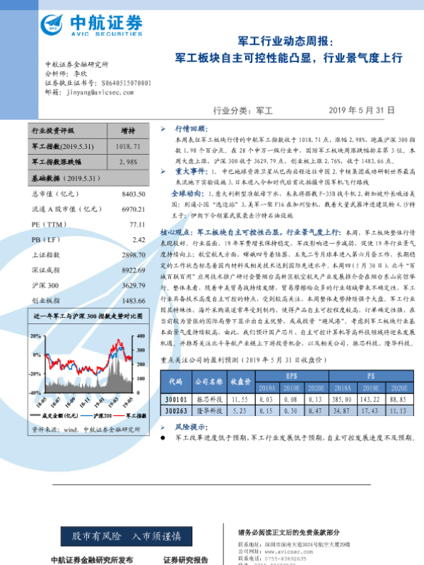 【中航证券】【20190531】20190531-中航证券-军工行业动态周报:军工板块自主可控性能凸显,行业景气度上行-12页 行业研究