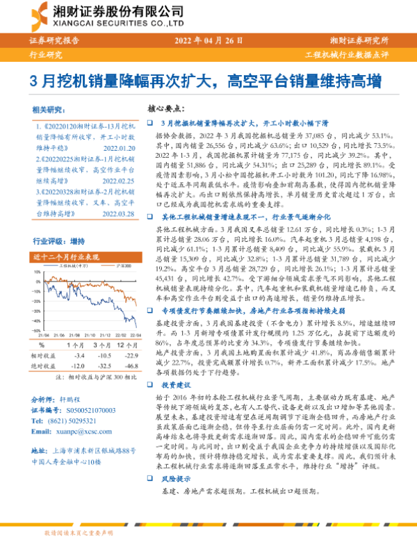 【湘财证券】【20220426】20220426-湘财证券-工程机械行业数据点评:3月挖机销量降幅再次扩大,高空平台销量维持高增-10页 行业研究
