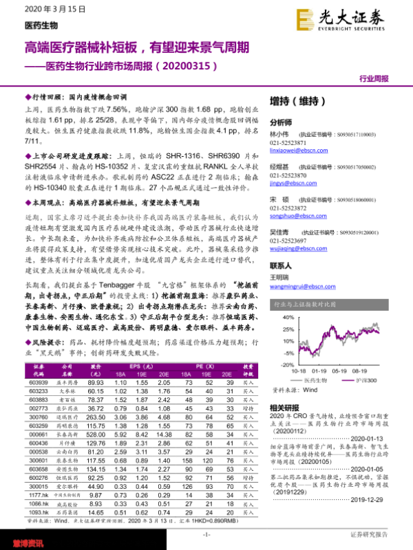 【光大证券】【20200315】医药生物行业跨市场周报:高端医疗器械补短板,有望迎来景气周期-31页 行业研究