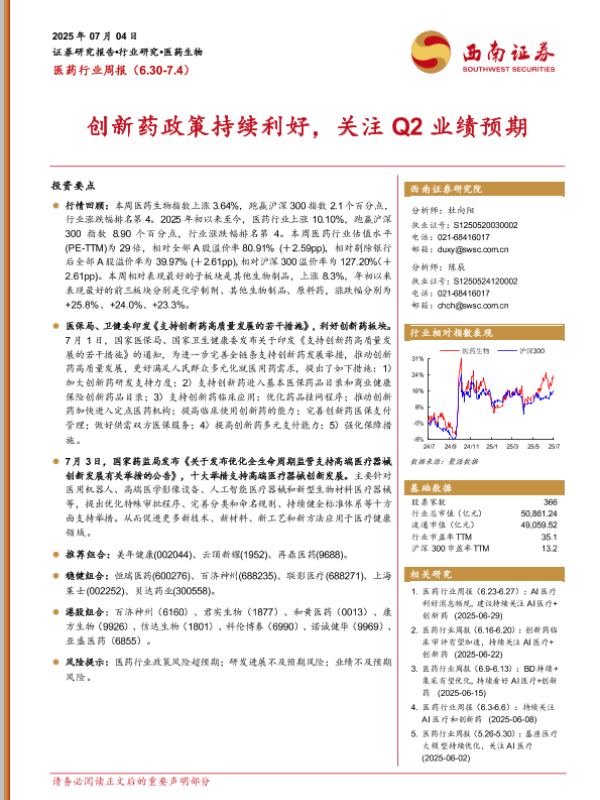【西南证券】【20250704】医药行业周报:创新药政策持续利好,关注Q2业绩预期-30页 行业研究