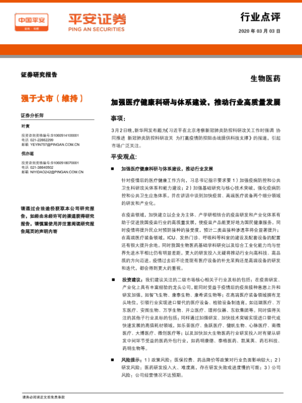 【平安证券】【20200303】加强医疗健康科研与体系建设,推动行业高质量发展-4页 行业研究