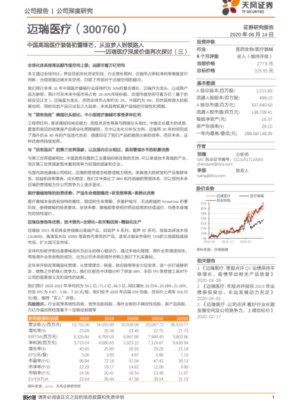 【天风证券】【20200614】迈瑞医疗深度价值再次探讨(三):中国高端医疗装备初露锋芒,从追梦人到领路人-41页 行业研究