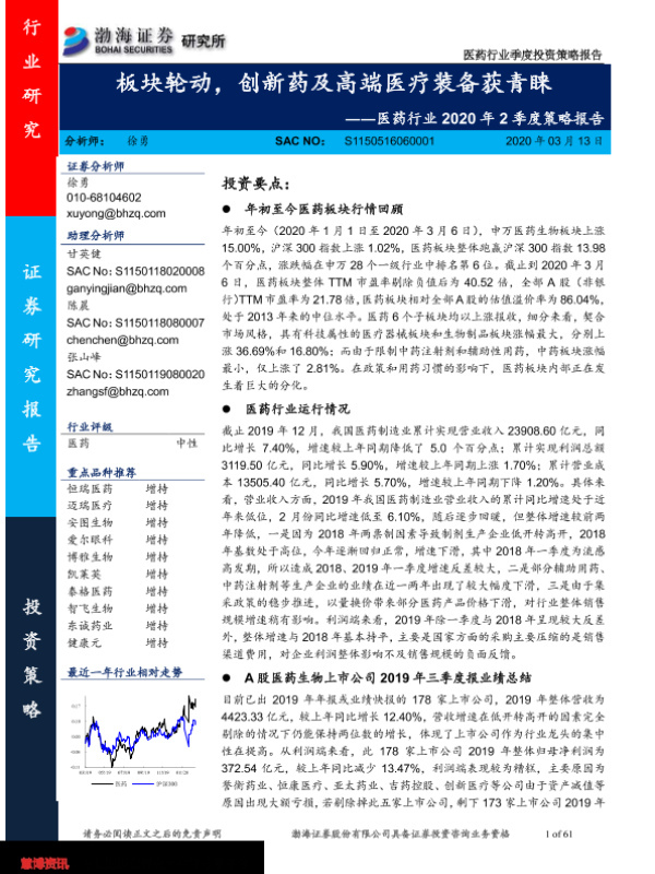 【渤海证券】【20200313】医药行业2020年2季度策略报告:板块轮动,创新药及高端医疗装备获青睐-61页 行业研究
