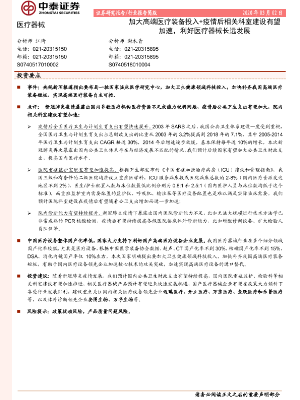 【中泰证券】【20200302】加大高端医疗装备投入+疫情后相关科室建设有望加速,利好医疗器械长远发展-2页 行业研究