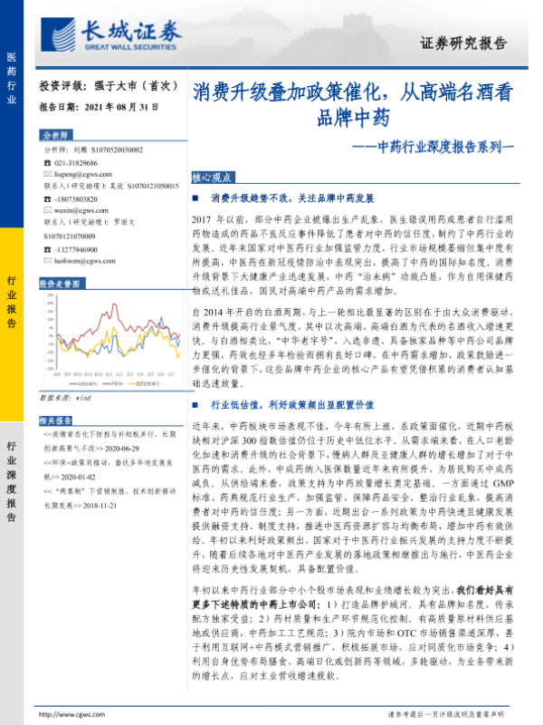 【长城证券】【20210831】中药行业深度报告系列一:消费升级叠加政策催化,从高端名酒看品牌中药-35页 行业研究