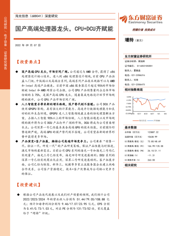 【东方财富证券】【20220907】海光信息(688041)深度研究:国产高端处理器龙头,CPU+DCU齐赋能-30页 行业研究