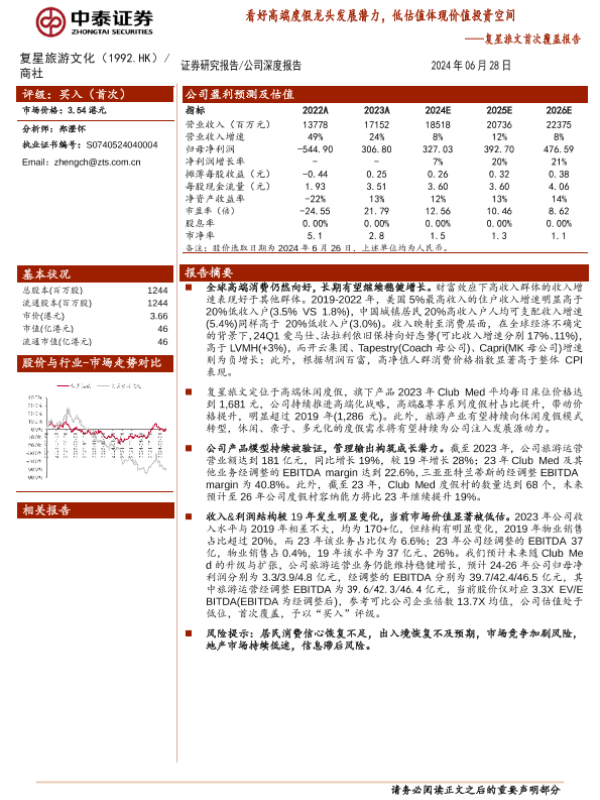 【中泰证券】【20240628】复星旅游文化(1992.HK)复星旅文首次覆盖报告:看好高端度假龙头发展潜力,低估值体现价值投资空间-15页 行业研究