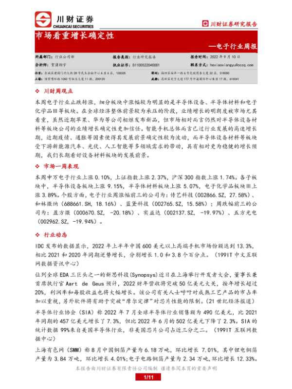 【川财证券】【20220910】电子行业周报:市场看重增长确定性-11页 行业研究