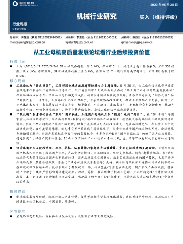 【国金证券】【20230528】20230528-国金证券-机械行业研究:从工业母机高质量发展论坛看行业后续投资价值-16页 行业研究
