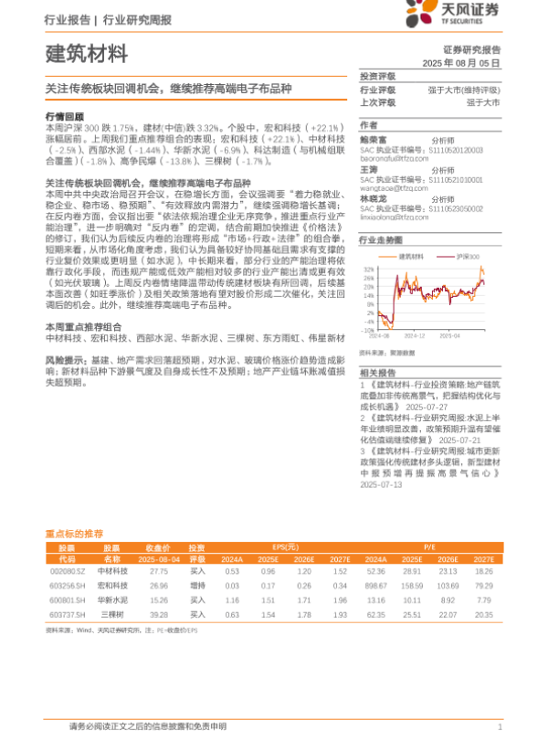 【天风证券】【20250805】建筑材料行业研究周报:关注传统板块回调机会,继续推荐高端电子布品种-5页 行业研究