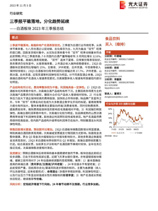 【光大证券】【20231105】白酒板块2023年三季报总结:三季报平稳落地,分化趋势延续-14页 行业研究