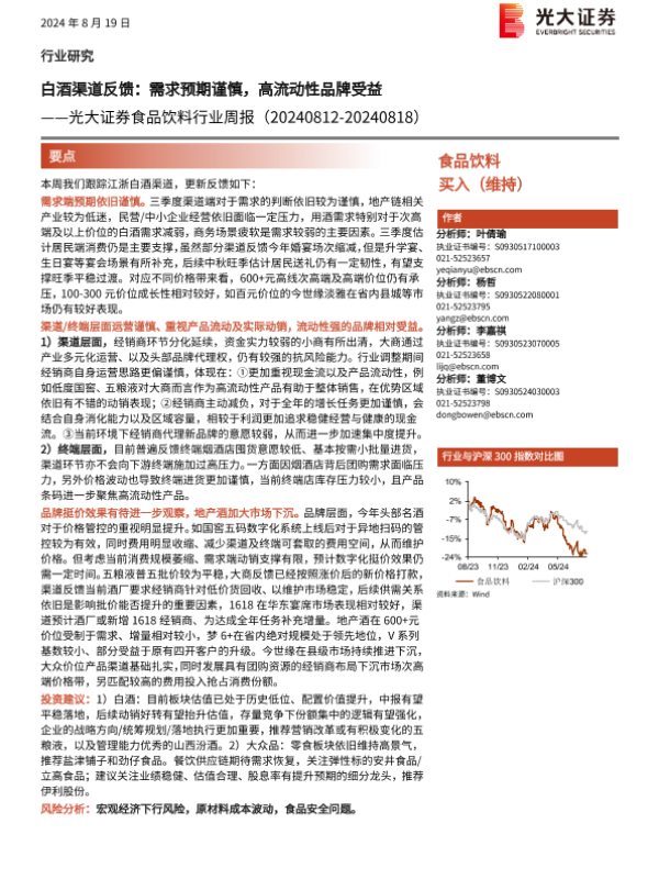【光大证券】【20240819】20240819-光大证券-食品饮料行业周报-白酒渠道反馈:需求预期谨慎,高流动性品牌受益-10页 行业研究