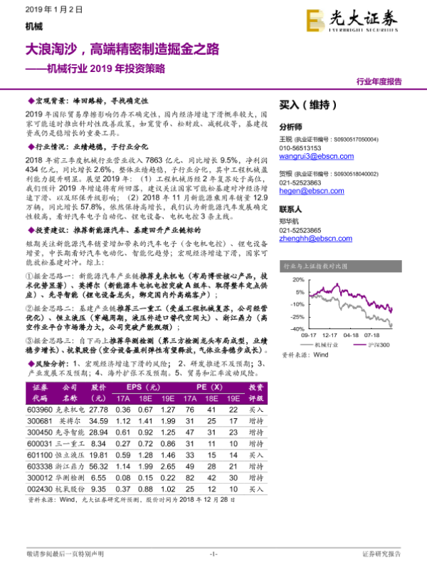 【光大证券】【20190102】机械行业2019年投资策略:大浪淘沙,高端精密制造掘金之路-60页 行业研究