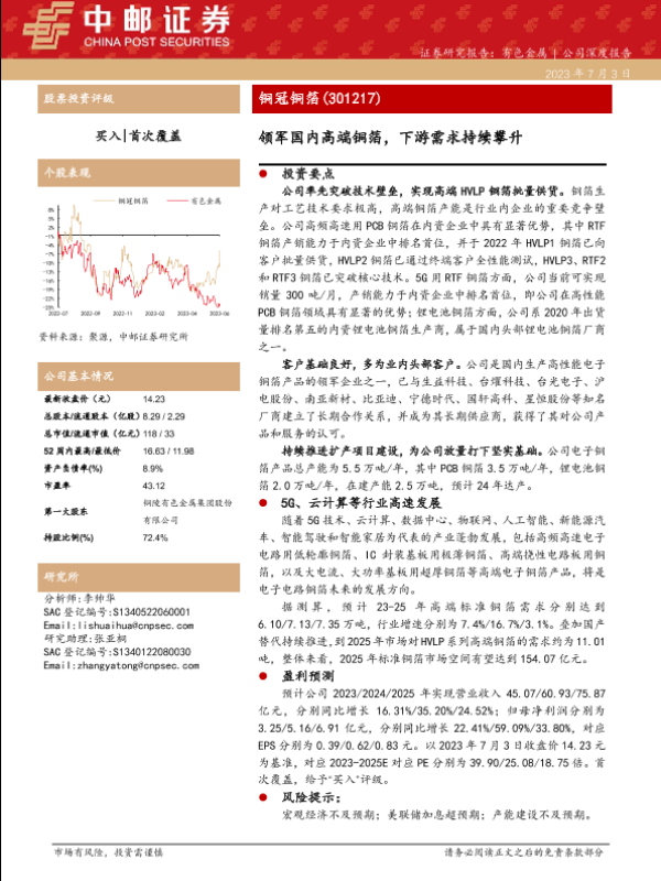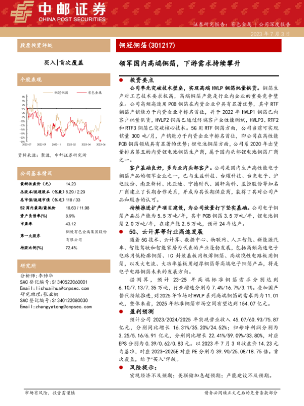 【中邮证券】【20230703】铜冠铜箔(301217)领军国内高端铜箔,下游需求持续攀升-21页 行业研究